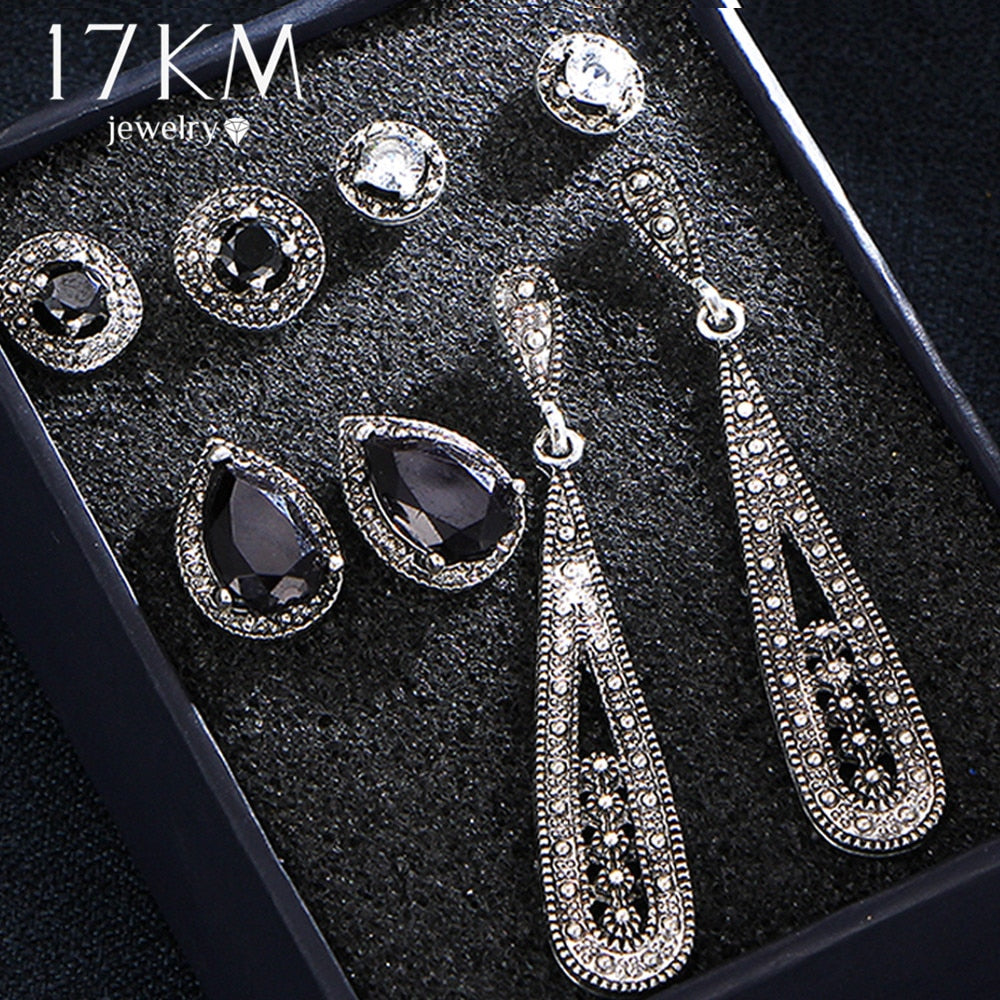 9 Design Vintage Water Drop Crystal Earrings Set For Woman Black Stone Silver Color Geometric Round Stud Earrings Boho Jewelry